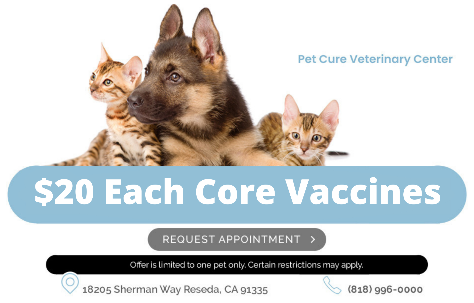 We are here for you, we are here for your pet, and we are your neighborhood’s favorite vet. Please don’t hesitate to contact us today at (818) 996-0000 to request your pet’s appointment!